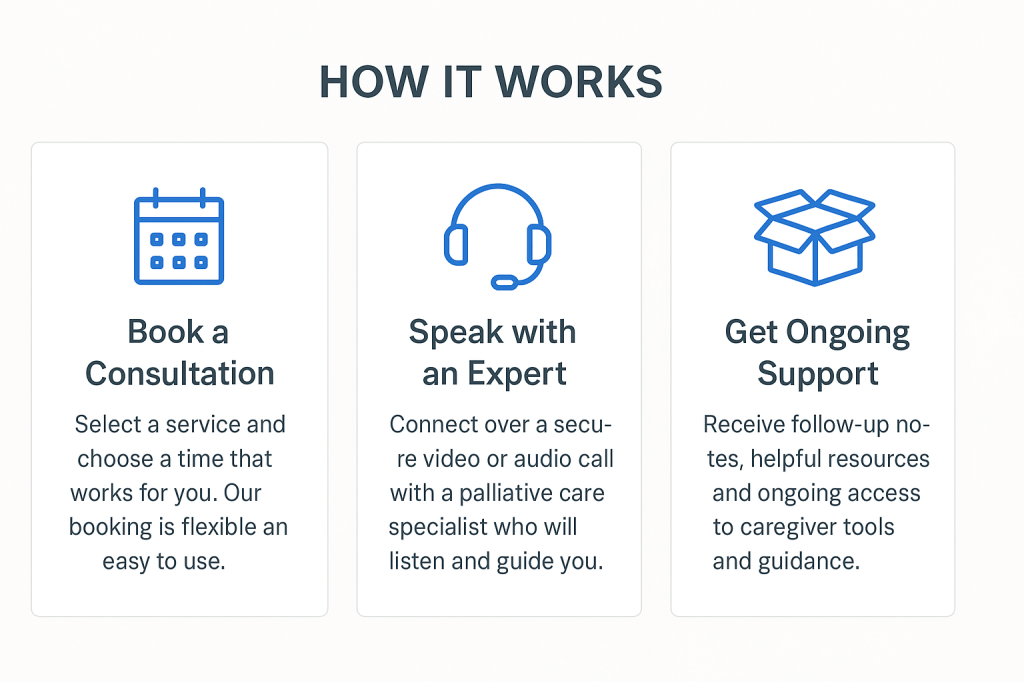 Through secure video consultations, our palliative care team offers personalized, holistic support to patients and families. These sessions are designed to address not just medical needs, but the emotional, logistical, and existential aspects of care.